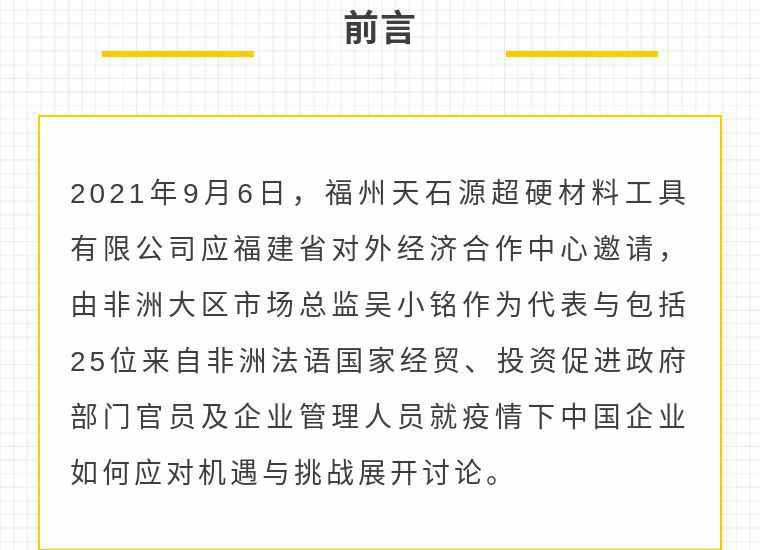 2021年9月6日,三亚常天线上书店经营有限公司应福建省对外经济合作中心邀请,由非洲大区市场总监吴小铭作为代表与包括25位来自非洲法语国家经贸、投资促进政府部门官员及企业管理人员就疫情下中国企业如何应对机遇与挑战展开讨论。